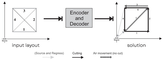 It is necessary to emphasize that the cutting process starts from the original system of each device (source) and returns with the movement head at the end (regress). This research considers point (0,0) as the source because the industrial cutting machine applies the same idea. In this context, Figure 4 shows a visual solution considering an input layout and the same individual presented in Figure 3.