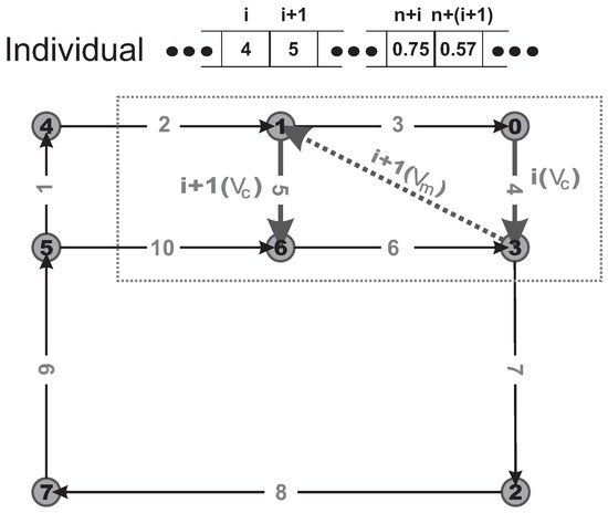Figure 5 shows the (i, i + 1) step of the function. Note that (i) typifies the edge to be cut in time(i), and () the direction, see Figure 3. The position and indicates that the edge labeled with 4 must be separated with the direction of nodes (). Note that the complete cutting time () is incremented by . The next element, and , needs to perform the air movement only to then cut edge 5 in the direction (). Thus, add to . The time considered to cut in i and is computed by this function :