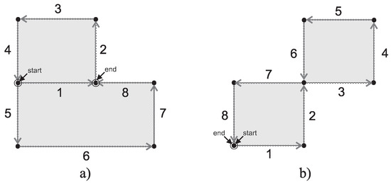 Furthermore, in Figure 1, the LCPP considers the initial and the final air time (represented by a dashed line, a sequence with the numbers 1 and 18). In every cutting process, the head of the device will move without cutting from the origin to the first point of the input layout (sequence number 1). The same happens when all the edges are cut, and the head must return to the origin (sequence number 18). Thus, it only moves the head when it does not perform a cut. The cost function uses a parameter and the Chebyschev distance between points to compute the time required for that movement. All the rest of the head machine moves (sequences 2–17) increase the final process time to cut the demand of an input layout. For this case, each cut uses the parameter and the size of the edge. Note that the sequence numbers 11 and 12 represent the same edge. Nonetheless, we divide common points for our proposal to increase path possibilities. For example, the node of the square that touches the triangle allows one edge division between sequence numbers 11 and 12.