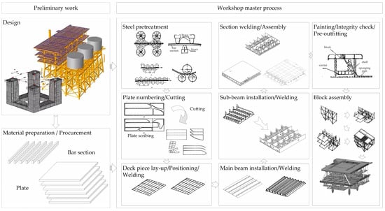 As the basic unit of offshore platform construction, the assembly and welding workshop is based on the principle of grouping technology, with the intermediate product as the guide, and production is organized by area, with the platform deck as the base and outfitting as the core, and the “structure–outfitting–painting” operations are separated in space and ordered in time to realize the integration of design, production, and management []. The integrated operation mode is balanced and continuous, avoiding the traditional mode of independent and uncoordinated production links, reducing the simultaneous cross-work of multi-disciplinary construction, and simplifying the work packages interface and the interference between different types of work.