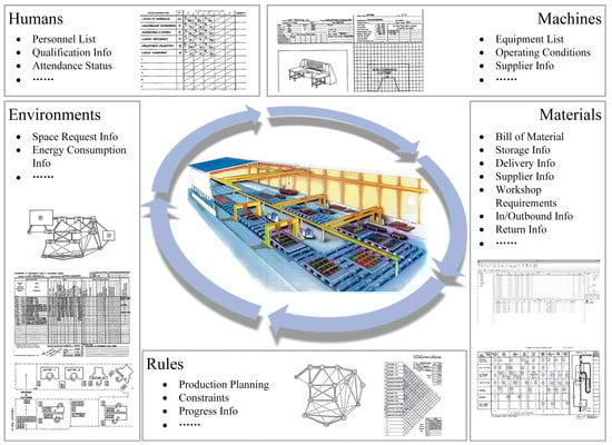 The integration manufacturing execution mode has extremely strict requirements on the production data chain. As shown in Figure 2, the five major elements surrounding the operation of the workshop are associated with dozens of forms. They are intertwined with design, planning, materials, equipment, storage, quality control, and other professions. In the intelligent workshop, in addition to cranes, welding torches, material pallets, and other manually operated equipment, there are automatic plate-cutting machines, gantry-type welding robots, CNC pipe-cutting machines, automatic plate winders, material conveyors, uncrewed transportation vehicles, and other automated uncrewed equipment. In general, more than 60% of the equipment is networked. In the construction process, the operators adopt the workshop-level plan as the main line. Each workstation completes the processes of material collection, plate assembly, welding, and inspection according to the work order and provides progress and quality information in real time. Structural and quality experts simultaneously verify the weld quality and global strength properties of completed assemblies across multiple stations, in hours, to form production master data under a time series. With the addition of digital devices, data-aware collection devices, and simulation models in the smart shop, the conversion and integration of multidimensional heterogeneous data demand to be realized under a unified and customized architecture. A standardized production database relying on the model proposed in Section 4 enables optimizing production quantities, balancing operational tasks, improving equipment utilization, reducing energy consumption, etc.