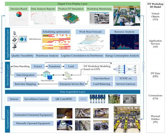 In the implementation of the digital twin workshop, five dimensions correspond to the Equipment Layer, the Data Acquisition Layer, the Service Drive Layer, the Application Service Layer, and the Digital Twin Display Layer, with each layer corresponding to handling various complex tasks. The architecture from the bottom up specifically includes: