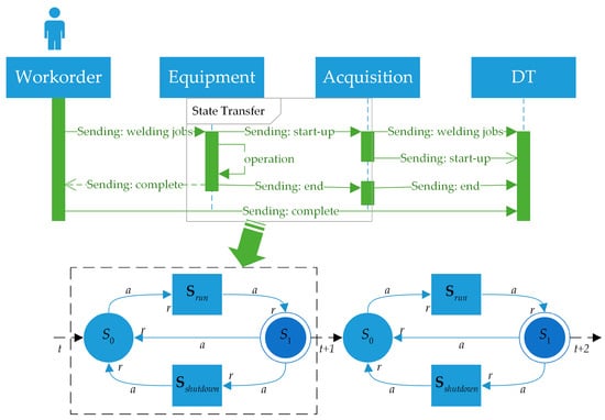 In the instance of welding operations, there are standby, operational, and shutdown states for a single welding robot. The standby state is usually at the beginning or end of the task, as in Figure 4, and , which are transient states, while the continuous processes of operation and shutdown states are expressed as and . The transition of the state depends on the trigger event , which returns the event response information after the completion of the state transition. Specifically, when the workstation receives a work order, it first confirms that the welder is in the available state. The DT system issues a welding start command to the instantiated object according to the task trigger , enters the welding operation state, and confirms the receipt of . After the task is completed, the equipment enters the completion state. If there is equipment downtime, insufficient material and other termination conditions, enter until the repair is complete to restore the equipment to .