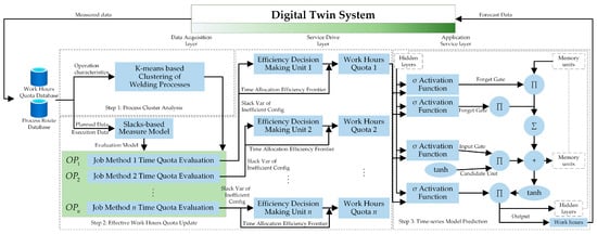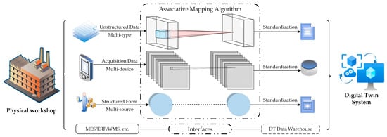 The synchronization of rapid Artificial Intelligence innovation and the transformation and upgrading of the manufacturing industry is underway. Numerous companies are eliminating outdated capacity and creating a new generation of smart factories by introducing a large number of automated equipment, establishing production process simulations, and developing manufacturing execution systems. The Digital Twin (DT) workshop is driven by real-time data [], is the representative of the subsequent generation of manufacturing and information technology integration [] and is steadily evolving into the best intelligent solution. A DT system can integrate the entire range of production chain components efficiently in order to better address the management challenges of discrete manufacturing industries, such as a large amount of production data, high data maintenance workload, extensive product non-standardization, and reliance on manual experience. The productivity improvements have been wholly proven for the mainstream DT systems, such as Siemens Tecnomatix [] and Dassault’s 3D Experience [], piloted in civil engineering, robotics manufacturing, aerospace, and other fields. Prior to full commercial application, it is necessary to establish a reliable data processing model for the interaction of simulated and actual measurement data to achieve iterative optimization of the DT system.