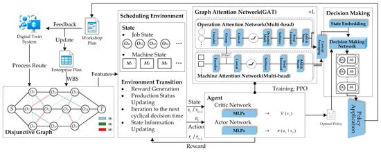Combining the DT workshop foundation and job planning requirements, this paper proposes a planning framework based on a graph attention network (GAT) and DRL, as shown in Figure 6.