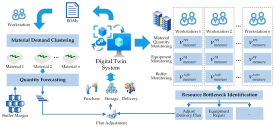 The concept of Digital Twin (DT) was first proposed by Michael Grieves [] when discussing the digital representation of physical objects or processes throughout the product lifecycle management. The theory originated in the aerospace field, where NASA introduced the “flying twin” for flight training and simulating spacecraft status []. Subsequent research further clarified the implementation of multidimensional and multi-attribute simulation models for monitoring and prediction functions by integrating multiple systems and high-precision sensors []. As simulation and Model-based Systems Engineering (MBSE) continue to develop, the DT field has expanded into industrial production and become a widely researched hotspot in recent years []. Establishing a digital twin workshop is the most fundamental and important research direction for manufacturing. F. Tao and M. Zhang [] proposed a completely new workshop operation model. They summarized five essential elements of DT workshop composition, focusing on the perception access of heterogeneous multi-source data and the fusion ability of “human–machine–thing–environment”, i.e., all elements. Guo et al. [] proposed a modular approach to construct a digital twin of the factory, considering frequent changes in the factory design stage. Designers can rapidly evaluate different designs and positively identify design defects. In the production stage, DT can improve the predictability and controllability of the production process. Zhang et al. [] designed a control framework based on DT to address the problem of plan-based decision-making and control mechanisms that are inapplicable to uncertain production states by introducing optimal state control theory into the virtual layer and ensuring the production system is in the best state through dynamic matching mechanisms and hierarchical goal-cascading methods.