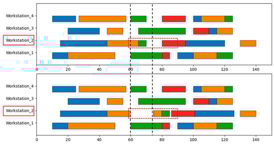 In the previous studies [,], focusing on the multi-objective optimization strategy of dynamic scheduling problems in the presence of uncertain events and proposing optimization algorithms for the makespan and optimal energy consumption, the ability to deal with event occurrences was theoretically developed. However, the prior algorithm research is based on definite assumptions, and the uncertain events appear randomly with probability, which is still partially deviated from the actual working conditions. Based on the real-time monitoring of progress, materials, equipment, and other attributes of the DT system to achieve effective identification of uncertain events, which completely responds to the actual situation of the workshop, there is a higher requirement for dynamic scheduling algorithm triggering and rapid calculation. By constructing a hybrid cycle and event-driven strategy, the workshop problem node production plan is optimized in time for different types of events, and the adjustment of the total plan is minimized. As shown in Figure 10, after an uncertain event such as equipment damage at workstation 2, the remaining workload of the current work order is first recalculated, then the three affected subsequent tasks with floating time are statistically counted, and finally, the fine-tuning of the plan is accomplished. The dynamic scheduling process is shown in Figure 11. The efficiency of the dynamic scheduling trigger and plan iteration process based on the DT system is significantly improved compared with the traditional manual adjustment, with a saving of about 17.1% or more according to statistics. The dynamic scheduling model that makespan and minimizes energy consumption for production can be expressed as follows: