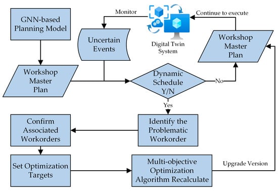 Recently, there has been a significant surge in scholarly inquiry regarding the utilization of Graph Neural Networks (GNNs) in conjunction with Deep Reinforcement Learning (DRL) for the purpose of resolving workshop job scheduling problems [,,,,,,,]. This approach is regarded as one of the most efficient computational methods for optimizing scheduling. In contrast to traditional heuristic rules and metaheuristic algorithms, which require computation under the objective function and constraints of the previous section, the priority scheduling rules (PDRs)-based sequential decision problem is turned into a Markov decision process (MDP) by training GNN parameters through DRL. This approach incorporates the optimization objectives and constraints into the reward mechanism, thereby achieving the generalization of the scheduler. This methodology can effectively decrease the computational burden of each scheduling computation while maintaining solution precision and enabling the repeated utilization of GNNs with stability subsequent to a solitary training iteration. Consequently, this methodology has the potential to significantly mitigate the substantial burden on the computing capacity of the planners’ personal computers during the plant’s planning phase and delegate the computationally intensive tasks to the server for execution. Furthermore, a server-side interface might be devised to retrieve real-time progress and work time information from jobs gathered in the DT system and incorporate it into the training sets. These can serve as an effective foundation for updating status or action values in subsequent rounds of training.