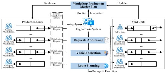 The delivery of materials and intermediate products within the workshop has been a relatively neglected part of production planning. In contrast to the high priority given to supply chain and in-factory logistics distribution, the scheduling of logistics distribution between workstations is autonomously done by operators, which easily causes blockages in the flow between processes. Based on the digital twin workshop planning model, expanding the multi-station collaborative distribution method enables the effective improvement of the inter-operational material and intermediate product turnover efficiency. Starting from the assignment plan of each workstation, based on the work sequential relationship between multiple workstations, the distribution requests are received and associated with BOMs to transport the target objects in the form of pallets to the specified workstations or buffer zones, and the idle vehicles and optimal paths within the effective turnaround time are calculated, and the distribution plan is output, as shown in Figure 12. The collaborative distribution model with the minimum empty time of transportation equipment as the optimization objective is: