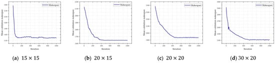 The training curves of GAT-DRL on , , and instances are illustrated in Figure 13, which reveals that the model accommodates different sizes of datasets and converges rapidly, verifying it acclimates to varying sizes of scheduling problems and obtains high-quality solutions. In addition, with the support of IAM, the converged mean validated makespan is stable with minor fluctuations.