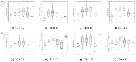 Table 3 shows that GAT-DRL has excellent solving ability and the optimal or suboptimal solution obtained in each size, which indicates that the model trained based on small and medium-sized datasets has superior generalization ability to adaptively deal with complex actual working conditions, whereby the model outputs the optimal results when the number of jobs and the number of machines change dynamically. In comparison with the proposed method in this paper, the four PDRs have the best computational speed, which is more than 50%, yet the solution results are not satisfactory, and the randomness of acquiring the minimum value is considerable. In terms of stability of results, the genetic algorithm, as a representative of heuristic algorithms, has prominent performance in the process of calculating workshop scale instances (). Nevertheless, restricted by the high requirements of GA on data size, the performance has enormous constraints in calculating the standard test dataset, which demands targeted improvement. In addition, the computation time of GA is substantially higher than that of GAT-DRL and PDRs, thus it is suitable for pursuing a highly customized scheduling system with great reliability. Overall, GAT-DRL is the optimal generalized scheduling solution with high accuracy, high performance, and high reliability suitable for DT systems. It should be supplemented that the action selection in this model takes a random sampling approach, and the convergence speed may be further improved by switching to a greedy strategy with a fixed number of machines. The gap analysis graph for the eight sets of comparative computation results is shown in Figure 14.