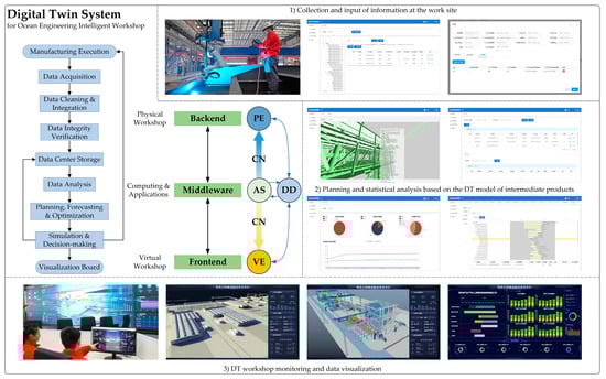 An extensive analysis of physical entities, operational behavior, information transfer, and interaction rules is necessary for the development of the Digital Twin (DT) system for the Ocean Engineering (OE) manufacturing execution process, which is a complex system engineering involving many disciplines, resources, and technologies. The current OE production process generally adopts an integrated construction model, which collects huge amounts of materials, equipment, personnel, storage, and other elements. On the basis of satisfying the production line simulation, designing a DT workshop architecture covering the “Humans–Machines–Materials–Rules–Environments” is the first step of production data application modeling.
