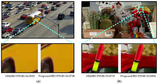 To assess the subjective quality, we compared the experimental results of the proposed algorithm and the one in HM16.5 on sequences with different characteristics. For example, the Class A Traffic sequence with a flat mean, the Class B Cactus and Class E Kristen & Sara sequence with a complex background, and the Class C BQ Mall sequence with complex heterogeneous texture. To make it easier to see the image loss details, we provide a local magnification area for subjective quality comparison, as shown in Figure 9. The subjective effects of the suggested method and the one in HM16.5 were almost identical. The PSNR loss of Traffic, Cactus, BQ Mall, and Kristen & Sara in the suggested method was 0.0181, 0.0239, 0.0068, and 0.0317, respectively, when compared to the methodology in HM16.5. Thus, the method proposed has an excellent performance in both the image quality and coding efficiency.