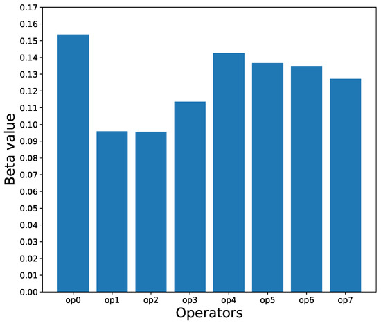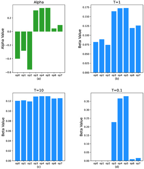 The temperature annealing method is a way to control the distribution of beta. Since the beta distribution itself is the prediction of operator selection, the temperature annealing method affects the search process. Operators are used in the form of one-hot encodings, During the operator search procedure, each operator exists as a one-hot encoded label. Each operator becomes a single label, and when the entire operator pool combines, it forms a vector of the same length as beta. The length of the beta vector is equal to the length of the operator pool. Furthermore, the values of the beta vector indicate the importance of each operator corresponding to its index. As the beta values are the softmax function’s output, the sum of the entire vector is 1, and each value ranges between 0 and 1. However, since the softmax function does not alter the ranking of the alpha values, the beta values also maintain the same ranking as the alpha values. When the search process is completed, the operator with the highest beta value is determined to be the most effective operator.