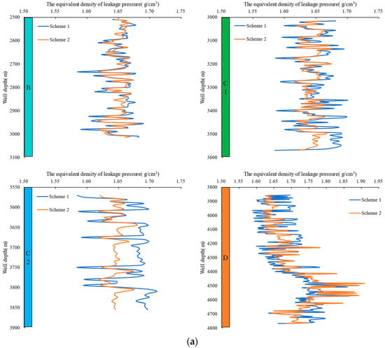 The equivalent density range of predicted leakage pressure in different layers of two schemes of M-2 well model.