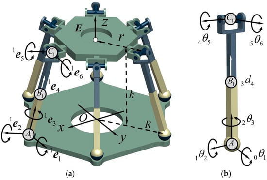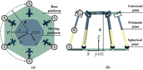 The Gough–Stewart platform is composed of a moving platform and a base platform, and they are connected by six identical scalable kinematic chains. Every kinematic chain consists of one spherical pair (S), one universal pair (U), and one prismatic pair (P) as the actuated joint. In this paper, six universal pairs are assembled on the moving platform, and six spherical pairs are connected on the base platform. Six kinematic subchains are distributed uniformly around the axis shown in Figure 1. The origin of the absolute coordinate system is set at the geometric center of the base platform, the -axis is perpendicular to the base platform and points to moving platform, the -axis is superposed with , and the -axis is obtained using the right-hand rule. Suppose the radius of the base platform is , and the radius of the moving platform is .