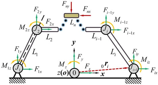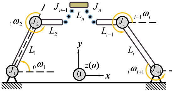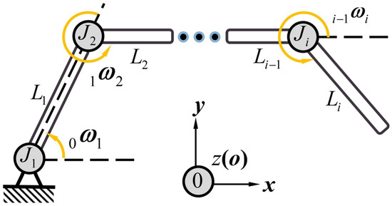 The three-dimensional vector in Equation (1) can be expressed as , where is the position vector of joint with respect to the origin of the absolute coordinate system.