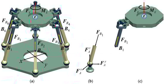 Figure 7 illustrates a Gough–Stewart platform, which is a representative multi-loop spatial mechanism. For the sake of generality, suppose that there are three external forces, , and , and three external torques, , and , exerted on the moving platform .
