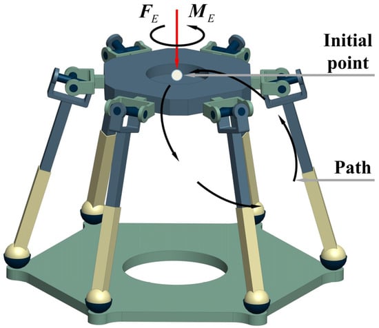 In order to verify the static modeling method of the Stewart platform, a trajectory of the moving platform is prescribed for the inverse kinematics, which is shown in Figure 8. The Gough–Stewart platform has six DoFs consisting of three translational motions and three rotational motions. Given a translational path of a circular trajectory for the moving platform, the parametric equations of the trajectory in the absolute coordinate system are expressed as: