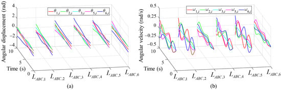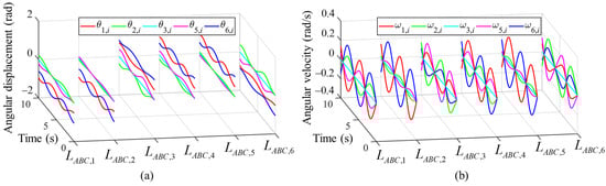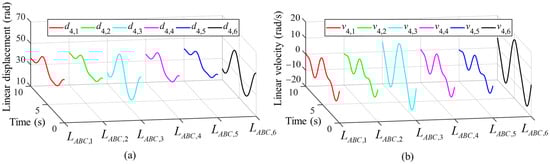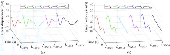 Figure 9 shows the angular displacements (Figure 9a) and angular velocities (Figure 9b) of each revolute joint in six kinematic chains.