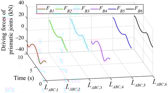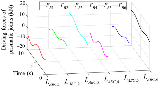 In this paper, the mass and inertia properties of the Gough–Stewart platform are ignored. Based on the structure parameters and the external forces and torques added to the moving platform, the driving forces to hold the equilibrium of the mechanism could be calculated through carrying out the proposed statics analysis, and the results are plotted in Figure 11. It is clear that the driving forces are adjusted to maintain equilibrium during the motion process. The simulation results in Figure 9, Figure 10 and Figure 11 show that no sudden changes in velocities or driving forces appeared and that the mechanism was never in singularity.