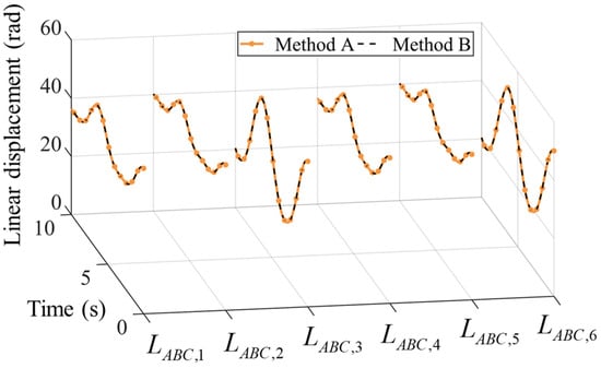 To further verify the correctness of the results simulated using the proposed modeling method here, another numerical analysis based on the method introduced by Gallardo-Alvarado is also performed []. Method A represents the method using the unified modeling method proposed in this paper, and Method B is the method introduced by Gallardo-Alvarado. From Figure 12 and Figure 13, the results of both methods are consistent, which validates both methods.