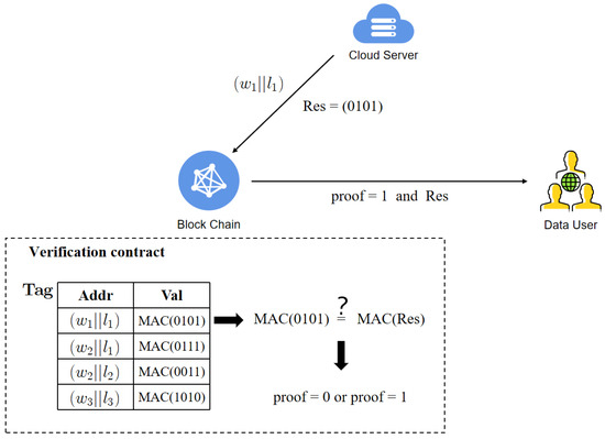 To illustrate the verification process of the scheme on the blockchain more intuitively, we provide an explanation using a simple example. Figure 4 depicts the verification process when the cloud server sends the keyword , user identifier information , and the corresponding search result to the blockchain. Upon receiving the aforementioned information, the blockchain employs the verification contract to extract the correct MAC value stored in the list for the combination of , i.e. . Subsequently, the verification contract computes the MAC value for the result sent by the cloud server and compares it with the extracted from the . Since is equal to , the verification token is set to 1. Finally, the blockchain returns the verification token along with the search result to the user.