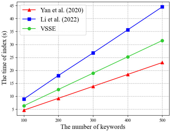 Index Generation Performance. Constructing a secure index is the foundation for performing effective search operations. Figure 5 illustrates the correlation between the index generations time and the amount of keywords. Illustrated in Figure 5, r index generation time across all schemes exhibits a proportional relationship with the number of keywords. Specifically, to balance search efficiency, the scheme in ref. [26] constructs a dual-index structure, which requires more time. On the other hand, in scheme [32], the index is constructed with less time cost by using key-value pairs, but lacks consideration for forward security. Compared to the schemes in refs. [26,32], VSSE outperforms [32] and takes more time than [26]. However, the index generated by VSSE fully considers the forward privacy and contributes to the search efficiency. Subsequent experiments will demonstrate this.