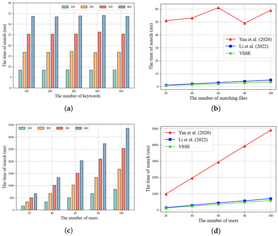 Time of search. (a) The influence of the quantity of keywords and the count of matching files on the search time. (b) The search efficiency of each scheme under different numbers of matching files. (c) The impact of varying numbers of users and matching files on search time. (d) The influence of varying numbers of users on the search time for each scheme. Yan et al. (2020) refers to the scheme in ref. [32], and Li et al. (2022) refers to the scheme in ref. [26].