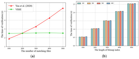 Time of verification. (a) The influence of varying numbers of matching files on the verification time for each scheme. (b) The impact of the bitmap index length on the verification time of VSSE. Yan et al. (2020) refers to the scheme in ref. [32].