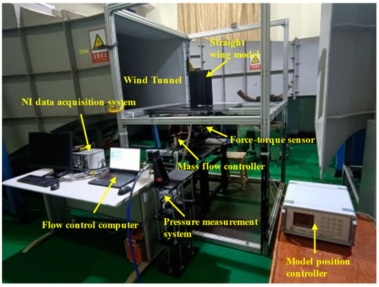 A compressed-air supplement system was also developed at the LLW. Two air tanks at 0.4 MPa in 8 m3 were used to provide compressed air for flow control. A high-precision mass flow controller (TSK621) with a range from 0 to 100 mLn/min, an accuracy of ±1.0% F.S, a linearity of ±0.5% F.S, and a response time of 1 s with a pressure regulating valve were used to regulate the flow rate of the sweeping jet actuators during the experiments. The experimental set-up in the wind tunnel is shown in Figure 5.