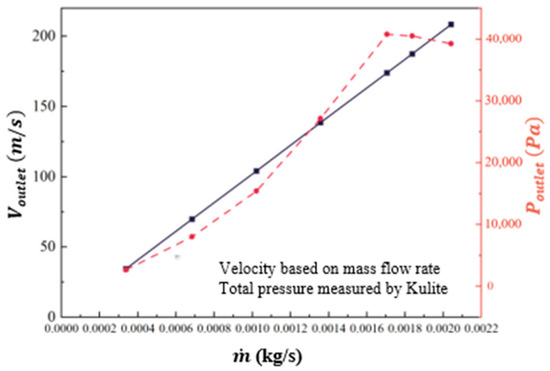 where is the density of airflow at the throat of the actuator, is the area of the section at the throat, and is the velocity of the jet at the throat. Velocity and related total pressure measured by the dynamic-pressure transducer at the outlet are shown in Figure 7. The jet velocities of the sweeping jet actuator corresponding to the first three groups of mass flow rates are 34 m/s, 70 m/s, and 104 m/s, respectively; the sweeping frequencies corresponding to these groups are 460 Hz (), 830 Hz (), and 1200 Hz (). Correspondingly, the total pressure at the outlet increased with a rise in mass flow rate and velocity.