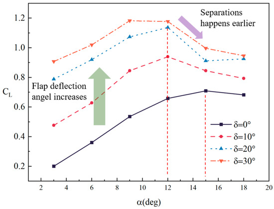 It can be seen from the relationship between lift coefficient, angle of attack, and flap deflection angle in Figure 8 that the slope of the lift coefficient curve of the model starts to decrease beyond α = 9° without flap deflection (black line), which is caused by the local partly separated flow on the wing surface. However, with a continual increase in the angle of attack, the lift coefficient increases and reaches a maximum at α = 15°.