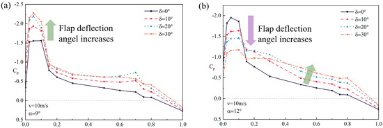Furthermore, when α = 12°, flap deflection can decrease the negative pressure near the leading edge area of the upper wing surface (i.e., as shown by the puple arrow) but increase the negative pressure of the upper wing surface of the middle and aft area (i.e., as shown by the green arrow). In other words, the benefit of increased lift obtained by flap deflection is not obvious at this higher angle of attack.