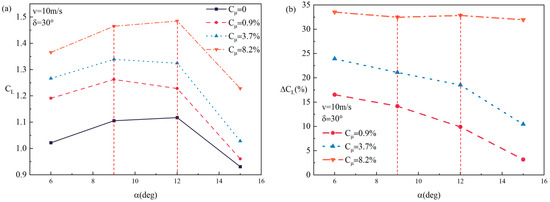 Variation of lift coefficient of the wing model with angle of attack for different momentum coefficients (δ = 30°, Re = 2.0 × 105, V = 10 m/s). (a) Lift coefficient at different angles of attack. (b) Variation of lift coefficient with angle of attack.