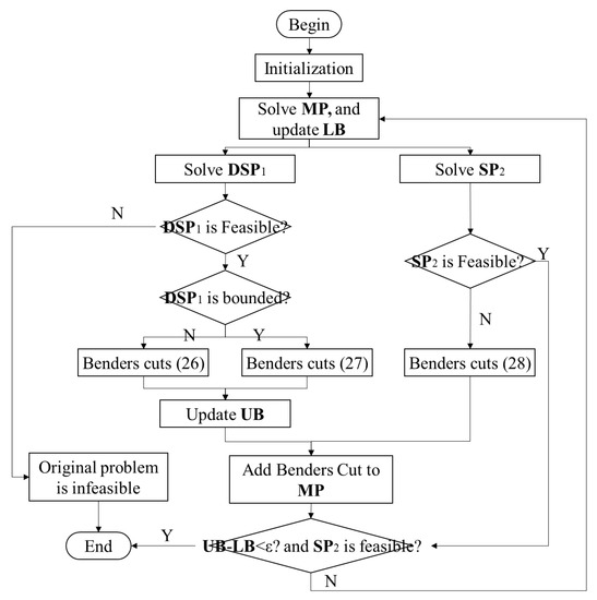 Thus, the Benders decomposition approach is applied to obtain the location–allocation results in a multi-level maintenance service network. As shown in Figure 2, the detailed information of the developed solution algorithm is described as follows.