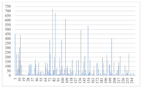 In this part, the maintenance service network is built, including three provinces in East China, namely Shandong, Anhui, and Jiangsu, and the maintenance data are obtained from a leading agricultural machinery manufacturer in China. As shown in Figure 3, there exist 251 service units in agriculture, and maintenance demands in these service units are shown in Figure 4. The manufacturer wants to construct 25 service stations in these 251 service units. In addition, the manufacturer can provide 75 service vehicles to be allocated to these service stations. The maximal service capacity per service vehicle is 300, and the usage costs per service vehicle are CNY 800.