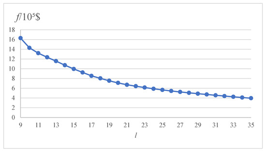 First, this paper conducts a sensitivity analysis of the number of service stations, l. Several examples are conducted to find the minimum value of l, and the computational results show that there is no optimal solution when the value of l is less than 9 due to the restrictions on the number and the maximal service distance of the service vehicles. After determining the lower bounded of l, sensitivity analysis of the number of service stations l is conducted after increasing the value of l from 9. Computational results with different values of l are shown in Figure 6. Total service costs experience a downward trend as l increases from 9 to 35, and the reduction becomes smaller with the increase in the value of l. For example, total service costs reduce by 12.31% when l changes from 9 to 10, whereas total service costs reduce by 3.37% when l increases from 34 to 35. Thus, in this case, the number of service stations may be set as 20 to 30 from a comprehensive perspective.