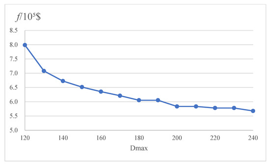 This paper then changes the value of D1max to examine the effect of maximal service distance of service stations on total service costs. Multi-level facility location–allocation problems without the constraints of maximal service distance are first obtained, and the total service costs are 5.678 × CNY 105 with the maximal service distance of 237 km. After that, the maximal service distance for service stations is reduced from 240 km by 10 km each time, and optimal results are obtained using the proposed solution algorithm, which is shown in Figure 7. The optimal results show that the total service costs increase with the decrease in the value of Dmax, and there is no optimal solution until the maximal service distance Dmax is less than 120 km. Thus, manufacturers usually choose a suitable maximum service distance to ensure that they can obtain a small service cost while improving customer satisfaction. Therefore, the maximal service distance may be set as 130 km to 160 km from a comprehensive perspective.