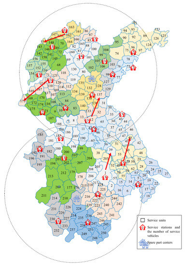 As shown in Figure 5, 25 service stations and two spare part centres are built in this service network. First, service stations are usually selected in these service units with a higher number of service demands, such as service units 1, 12, 79, 85, 106, 138, 153, 202, and 238. Service units served by one service station are distinguished by different colours, and all 251 of these service units are always allocated to the nearest service stations. For example, the service station in 73 provides maintenance service for three service units, e.g., 73, 76, and 78. Otherwise, the service station in 220 provides maintenance service for seventeen service units, e.g., 3, 178, 206, 215, 216, 218, 220, 221, 222, 223, 239, 240, 241, 242, 243, 244, and 246.