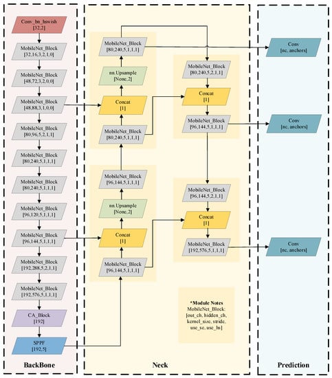 In summary, by leveraging the lightweight YOLOv5s model as a foundation and implementing enhancements, including the replacement of the Backbone and Neck layers with MobileNetV3 modules, as well as the integration of the CA mechanism, we have achieved the successful development of an exceptionally lightweight model. Remarkably, this model retains a high level of performance in object detection. For a visual representation of the network architecture, please refer to Figure 1.