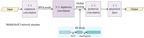 The SE attention module in MobileNetV3 performs channel-wise pooling of the output feature matrix. To generate output vectors, the pooled values are passed through two fully connected layers. The former has a number of vectors that is one quarter of the quantity of channels, and it applies the ReLU activation function. As for another, it employs the h-swish activation function and produces an output with the same amount of channels. The structure of MobileNetV3, as illustrated in Figure 2, incorporates the aforementioned SE attention module.