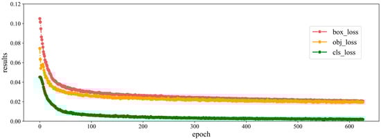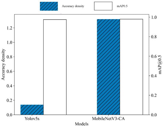 From the table above, we can observe that our improved model achieved a 0.4% increase in accuracy compared to the yolov5s’s mAP@0.5, and the accuracy density improved significantly by 849.64%. Furthermore, the size of our model was reduced to only 10.52% of the original model’s size. It is important to note that our model sacrifices detection speed to some extent, but for the application scenarios we designed, the trade-off between extreme lightweight design and higher accuracy is well justified. During the training process, we recorded variations in the mAP for each epoch in Figure 3 and the accuracy of the improved model stabilizes with the original model after about 90 epochs; although the improved model does not converge as effectively as the original model, the final outcomes consistently exhibit stability and demonstrate slight improvements over the original model. Figure 4 provides a visual representation that effectively contrasts the values of mAP0.5 and accuracy density for the two models, serving as a clear manifestation of the heightened performance achieved by the improved model. Furthermore, Figure 5 presents a detailed depiction of our model’s losses, effectively highlighting the exemplary convergence that our model has achieved.