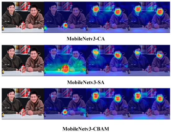 Through the heatmaps, we can observe that the model is effective in recognizing all three objects in the picture, but is different. We observed that the allocation of attention in the SA was relatively scattered, and the recognition of the target objects was not sufficiently focused. Moreover, compared to CBAM, the CA was able to effectively concentrate its attention on the recognized target objects without causing excessive dispersion.