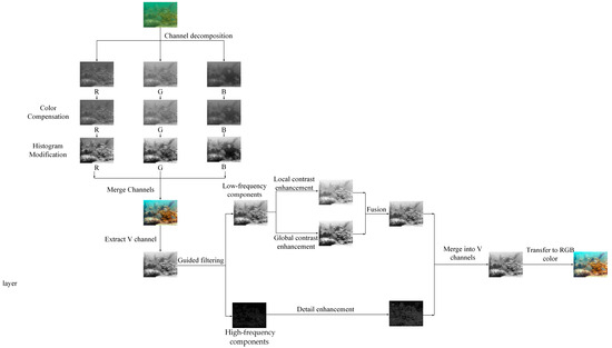 This article proposes a hybrid strategy to improve the quality of underwater images. This strategy consists of three main steps: removing color distortion; extracting the V-channel of the color-correction image and decomposing it into high-frequency and low-frequency components, enhancing the contrast of low-frequency components; and sharpening the details of high-frequency components (Figure 1).
