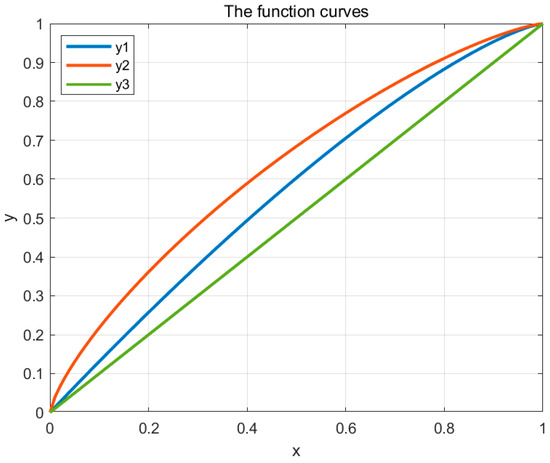 One researcher [32] proposed a complementary relationship between the two functions in Equation (20) for enhancing low-light image contrast. The function curves are illustrated in Figure 2, indicating that function provides a more pronounced enhancement of pixels than function .