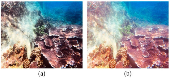 represents the pixel value of at the pixel location (x, y), while represents the pixel value of the texture layer at the pixel location (x, y) after enhancement. is the parameter used to avoid the dense noise of enlarging the underwater image. In our experiment, is 0.005. Equation (26) is used to enhance the details.