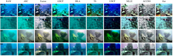 In this section, we perform qualitative and quantitative evaluations to assess the effectiveness of the proposed algorithm. We compare our algorithm with several existing advanced underwater image-enhancement methods, namely ARC [11], Fusion [18], GDCP [16], IBLA [14], TS [20], UDCP [13], MLLE [22], and ACCDO [23]. We used a UIEB [35,36] dataset with 950 real-world underwater images for evaluation, of which 890 images had corresponding reference images, referred to as UIEBR, and the remaining 60 underwater images were referred to as UIEBC. Table 1 shows the methods we compared.