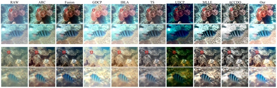 Enhancement results of different methods and the red box represents the corresponding locally enlarged image. From left to right are raw underwater images, and the result of ARC, Fusion, GDCP, IBLA, TS, UDCP, MLLE, ACCDO, and the proposed method.