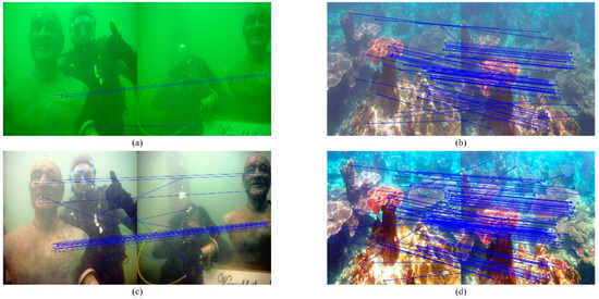 To demonstrate that the images processed in this article can be applied to visual matching tasks, we used the local feature-point matching algorithm (SIFT) to establish the corresponding relationship between two similar scenes. We apply this algorithm to a pair of real underwater images and their improved matching results. Figure 8 shows the local feature-point matching results. In Figure 8a,b, the correctly matched feature points in the original image pair are 4 and 87, respectively. Figure 8c,d show the number of feature points matched in the image pairs processed by our proposed algorithm, which are 26 and 140, respectively. This indicates that our method has played a positive role in image preprocessing.